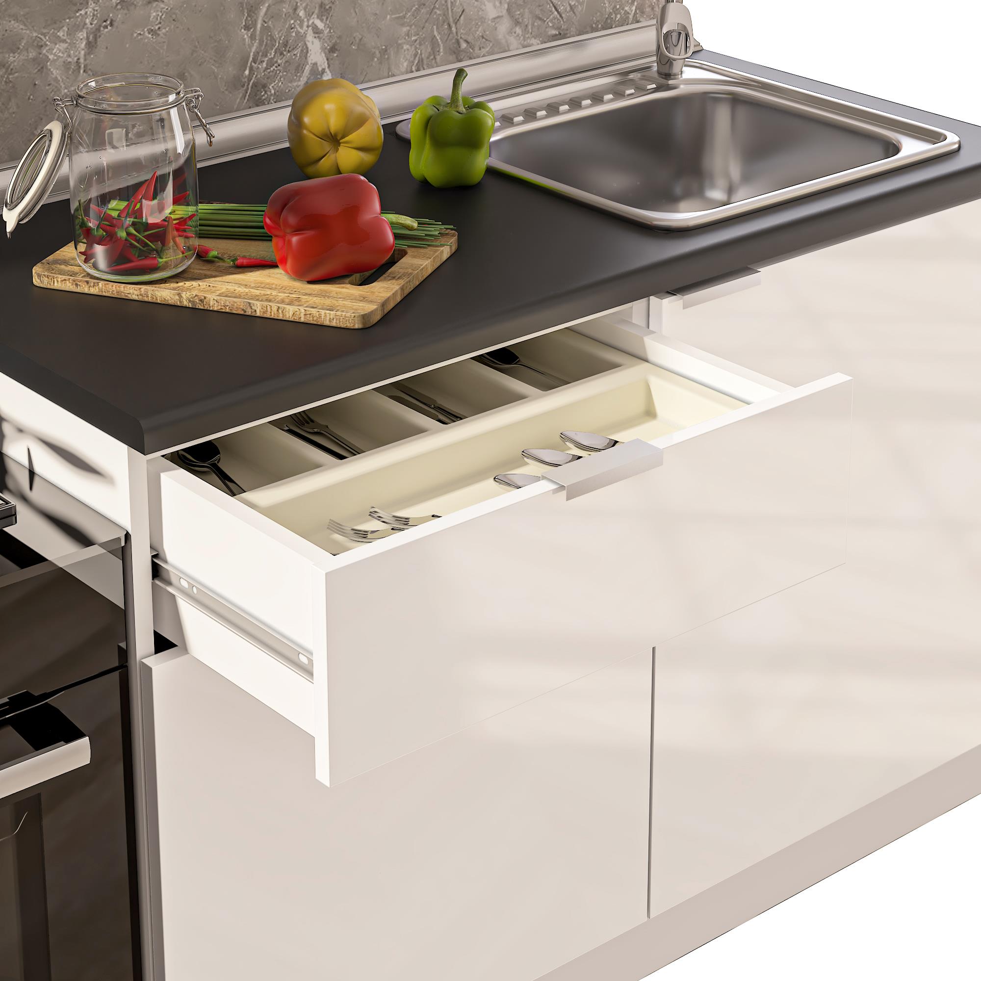 - Çatal-bıçak ve sofra takımlarından tavaya kadar her şeyi saklayabilirsiniz, çünkü bu kombinasyon hem çekmecelere hem de dolaplara sahiptir.