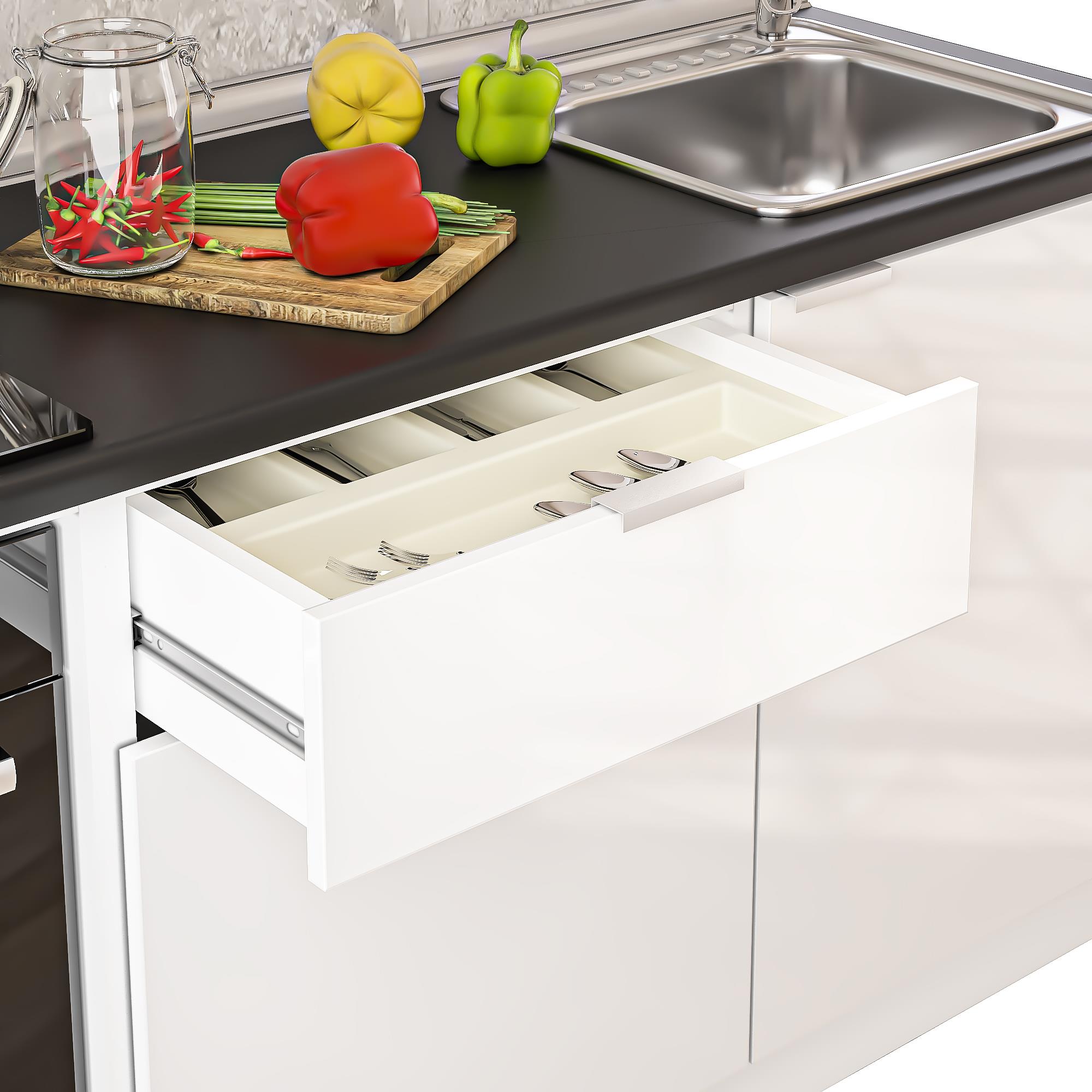 - Çatal-bıçak ve sofra takımlarından tavaya kadar her şeyi saklayabilirsiniz, çünkü bu kombinasyon hem çekmecelere hem de dolaplara sahiptir.