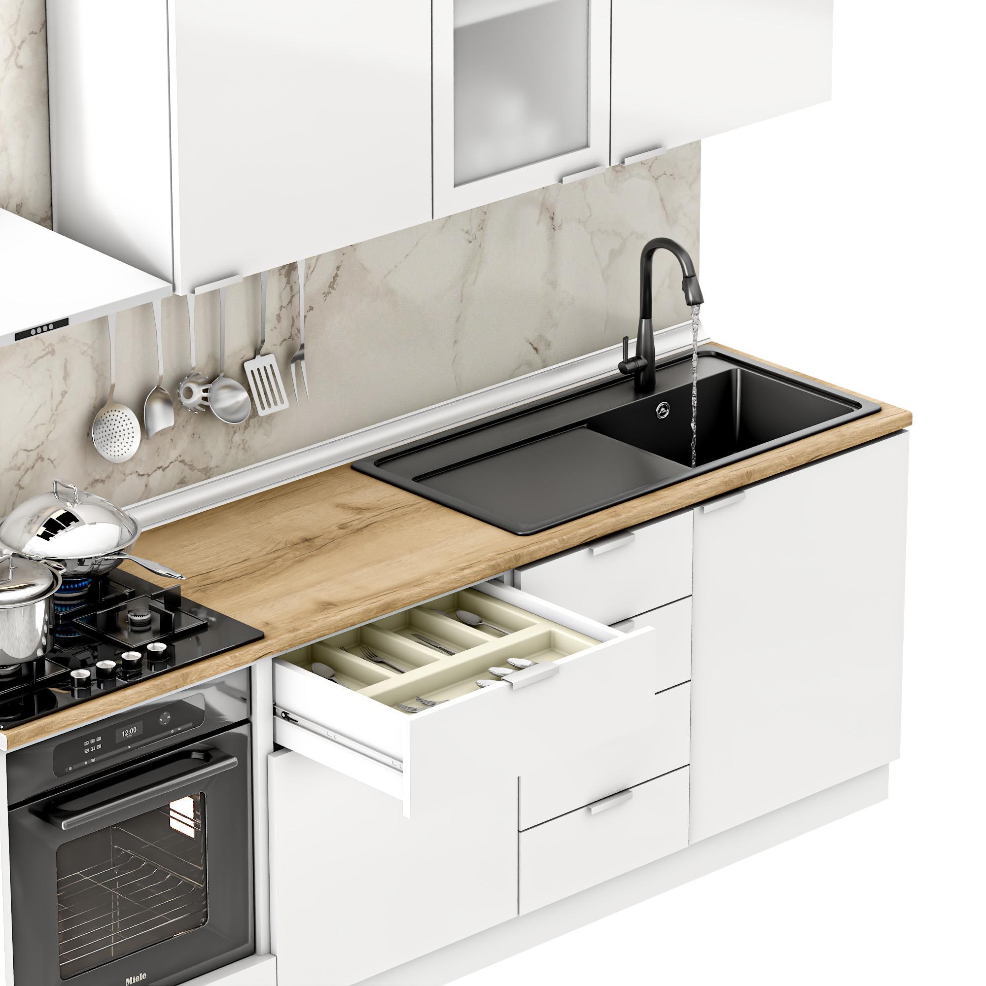 - Çatal-bıçak ve sofra takımlarından tavaya kadar her şeyi saklayabilirsiniz, çünkü bu kombinasyon hem çekmecelere hem de dolaplara sahiptir.