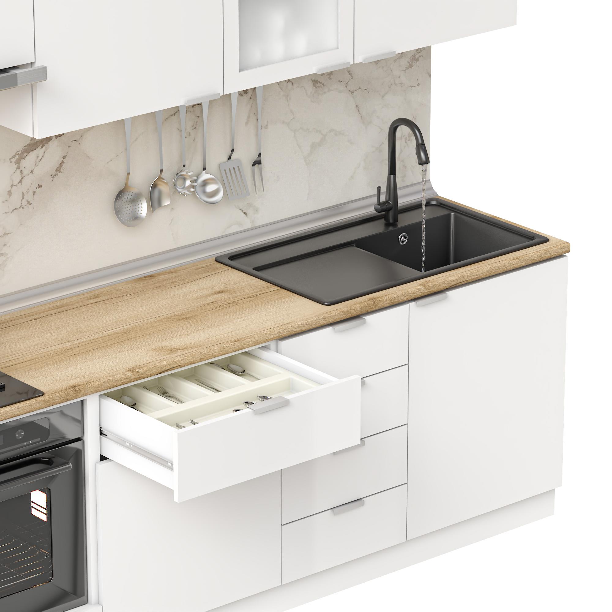 - Çatal-bıçak ve sofra takımlarından tavaya kadar her şeyi saklayabilirsiniz, çünkü bu kombinasyon hem çekmecelere hem de dolaplara sahiptir.